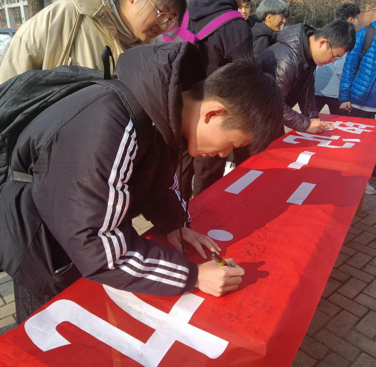 中午12点,校团委在图书馆前和至善湖旁边组织开展“齐心抗疫勇担当,不忘历史谱华章”主题签名活动。一千余名学生在“铭记‘一二·九’运动”的展板和条幅上签名。