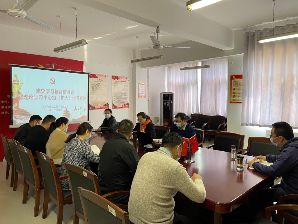 4月6日下午,土木与建筑工程学院党总支在A09-223会议室召开理论学习中心组(扩大)会议暨党史学习读书会,党总支中心组全体成员、各党支部书记参加会议。