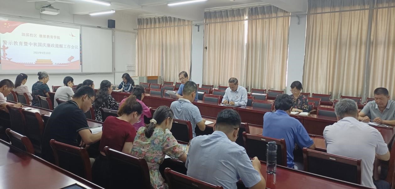 双节临近,为进一步加强校区党风廉政建设,营造清正廉洁的节日氛围,9月15日上午,洹滨校区、继续教育学院召开以案促改警示教育暨中秋国庆廉政提醒工作会议,全体教职工参加会议。