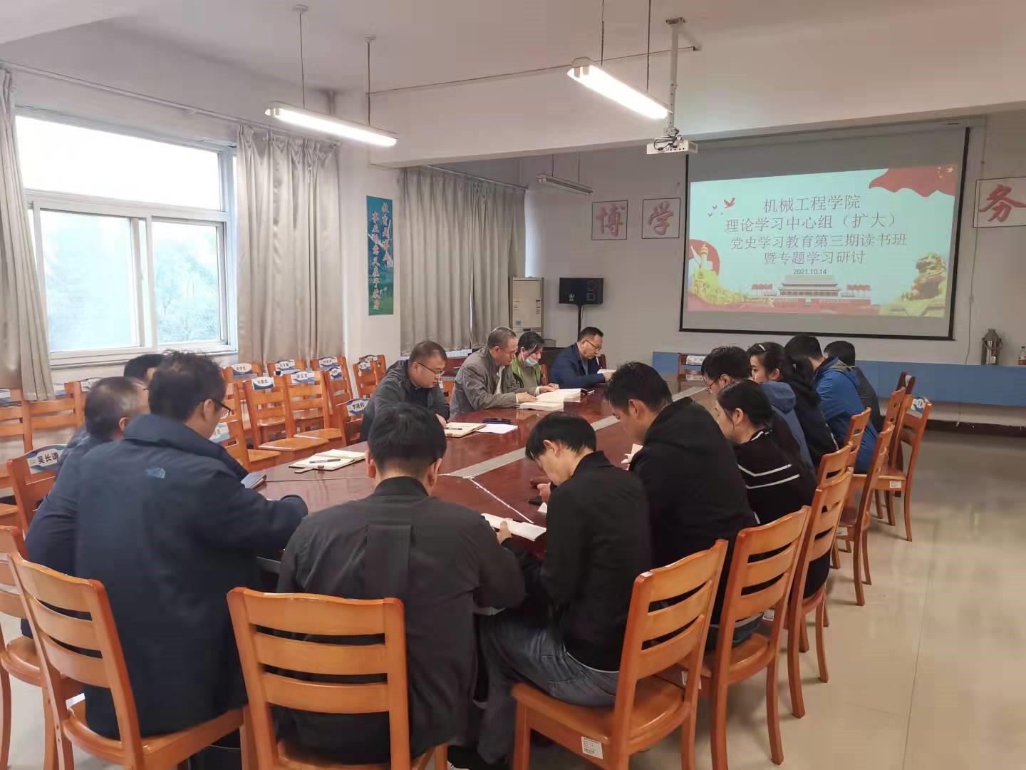 10月14日下午,机械工程学院党总支在A08-302会议室举办党史学习教育第三期读书班暨专题学习研讨会,党总支中心组成员、各党支部书记参加学习。