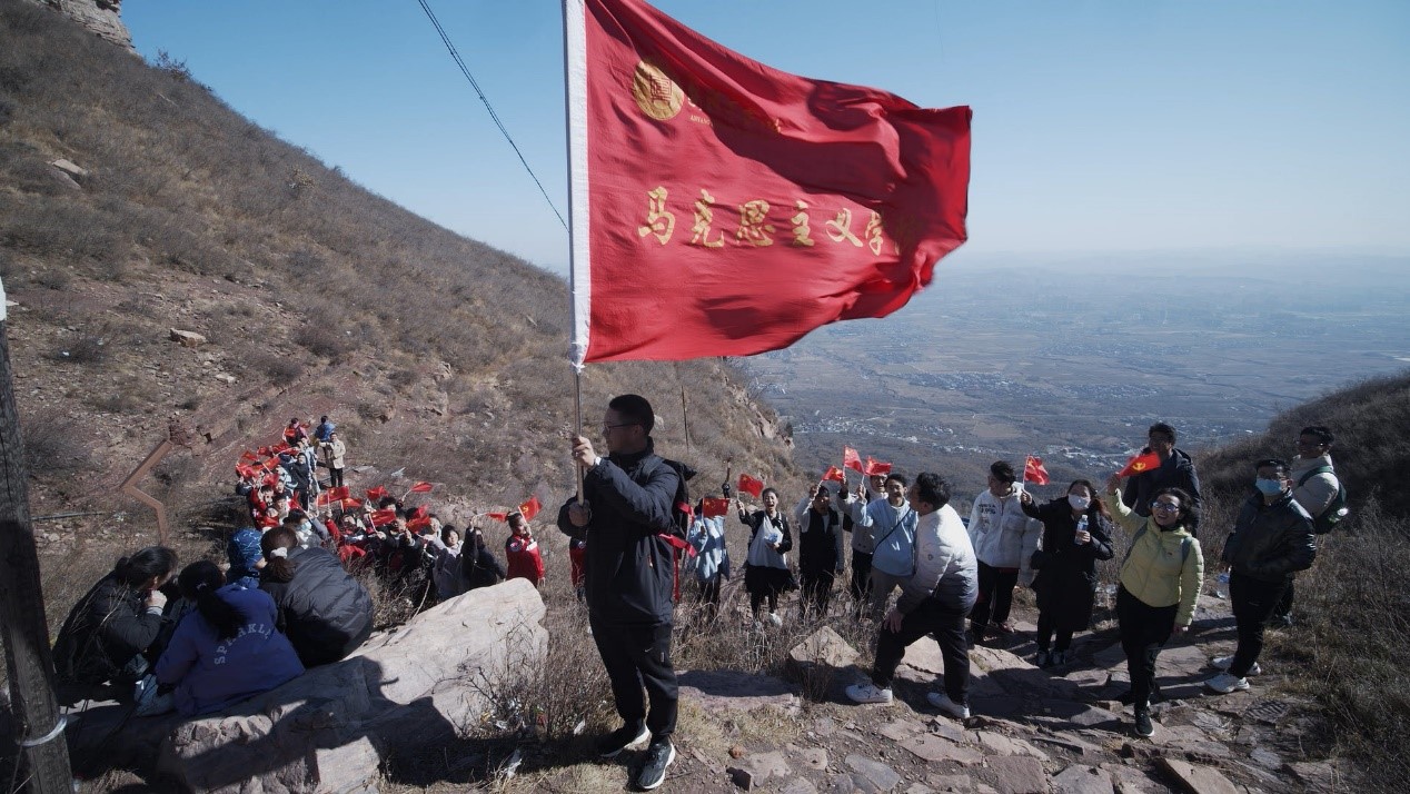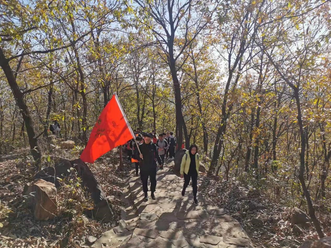 活动中,大家高举五星红旗,高唱《我和我的祖国》等红色歌曲,徒步穿越崎岖的山间小路,攀登至山顶,感受祖国的壮美河山。在中途休息期间,十余位同学为大家深情讲述了《朱德总司令与群众的军民鱼水情》《誉满太行的杀敌英雄吕法全》《林南战役》《抗美援朝烈士孙占元》等革命故事,带领大家一起追忆革命先辈,感悟红色文化和民族精神。