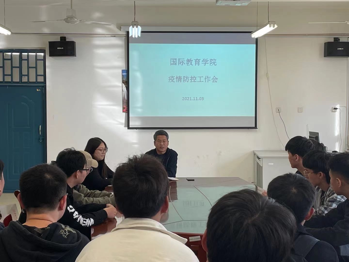 11月3日下午,国际教育学院在A12-303会议室召开全体学生干部疫情防控工作会,全体辅导员、学生干部参加会议。团总支书记姚战军老师主持会议,