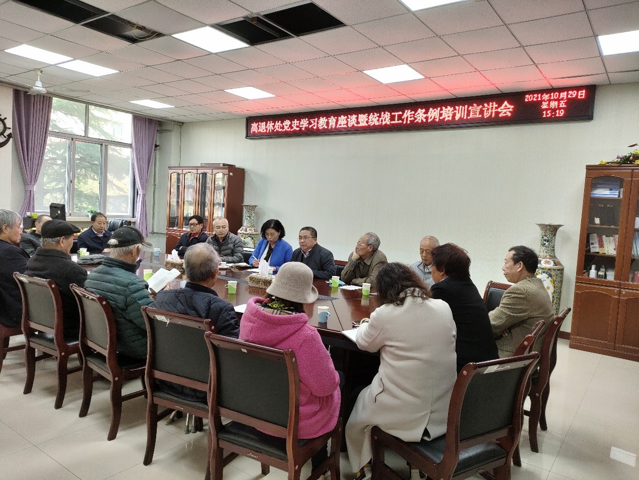 10月29日,离退休处召开党史学习教育座谈及统战工作条例培训宣讲会,部门领导班子成员、各党支部书记、离退休职工代表、各民主党派、党外知识分子代表20余人参加会议。离退休处处长张想竹主持会议。