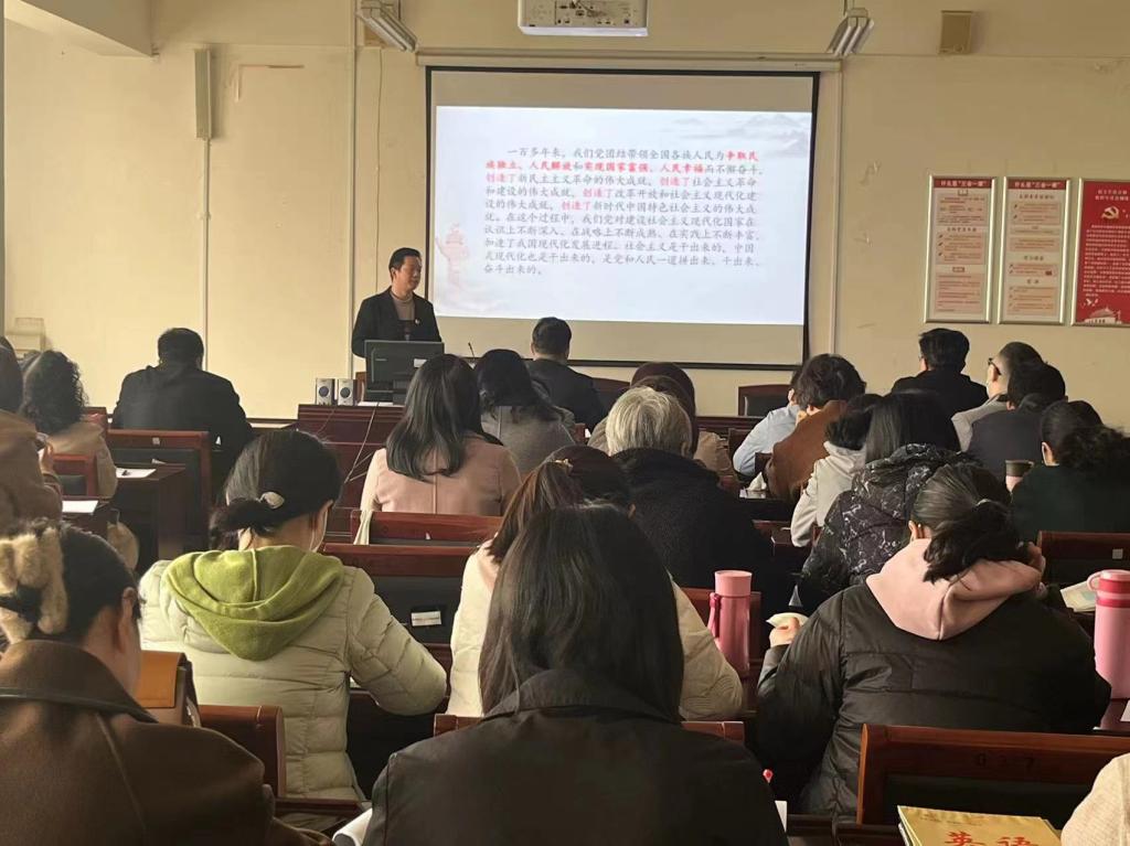 为深入学习贯彻党的二十大精神,3月22日下午,外国语学院邀请马克思主义学院青年骨干思政课教师刘畅为全体教师宣讲党的二十大精神。党总支书记王孟主持会议。