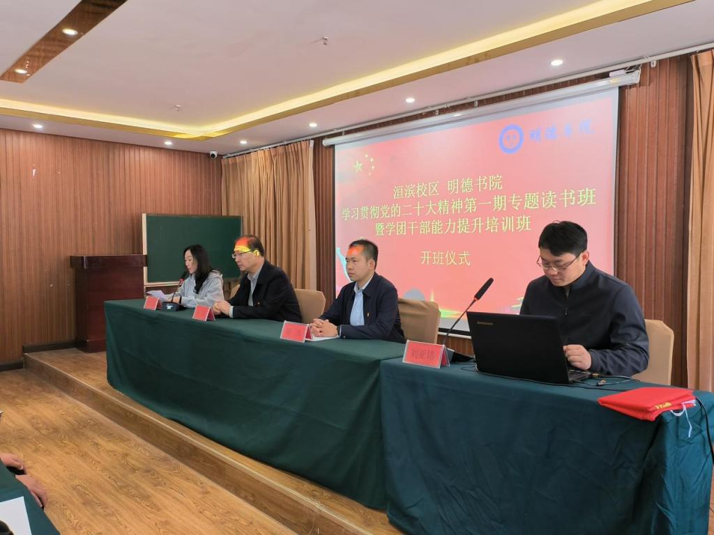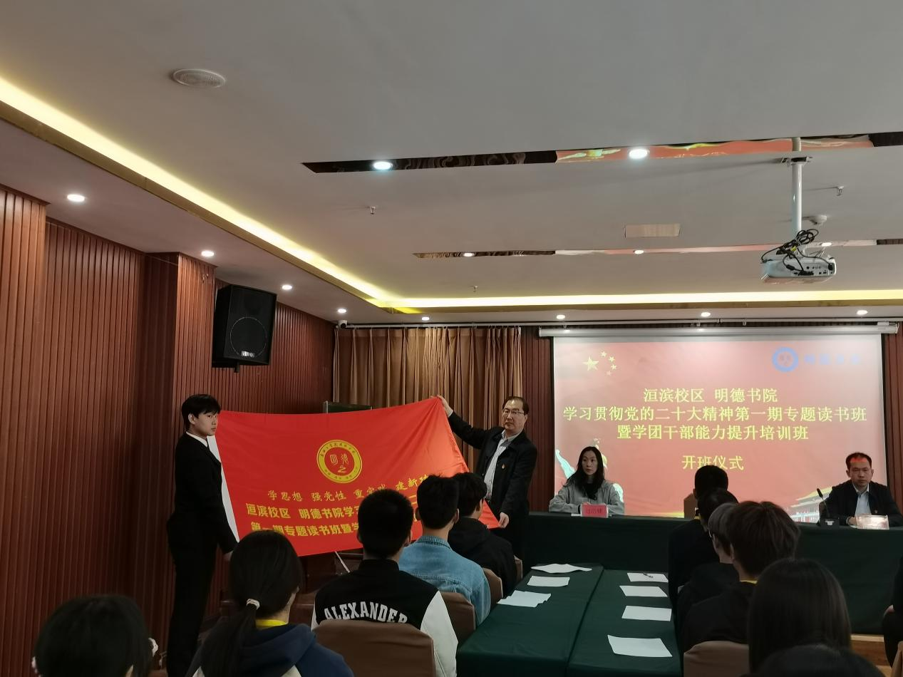 开班仪式上,洹滨校区、明德书院院长康博作开班动员讲话,以《深入学习宣传贯彻党的二十大精神在推进中国式现代化新征程中贡献青春力量》为题,他从“把握精神实质,全面领会党的二十大报告核心要义;强化党章意识,切实增强维护核心、维护党中央权威的政治自觉、思想自觉和行动自觉;做有理想、敢担当、能吃苦、肯奋斗的新时代青年,在推进中国式现代化新征程中贡献青春力量”三个方面,就如何深入学习宣传贯彻党的二十大精神做了专题辅导;党总支副书记赵浩婕宣布培训班主要日程,强调培训纪律要求;党总支书记王卫民为培训班授旗。