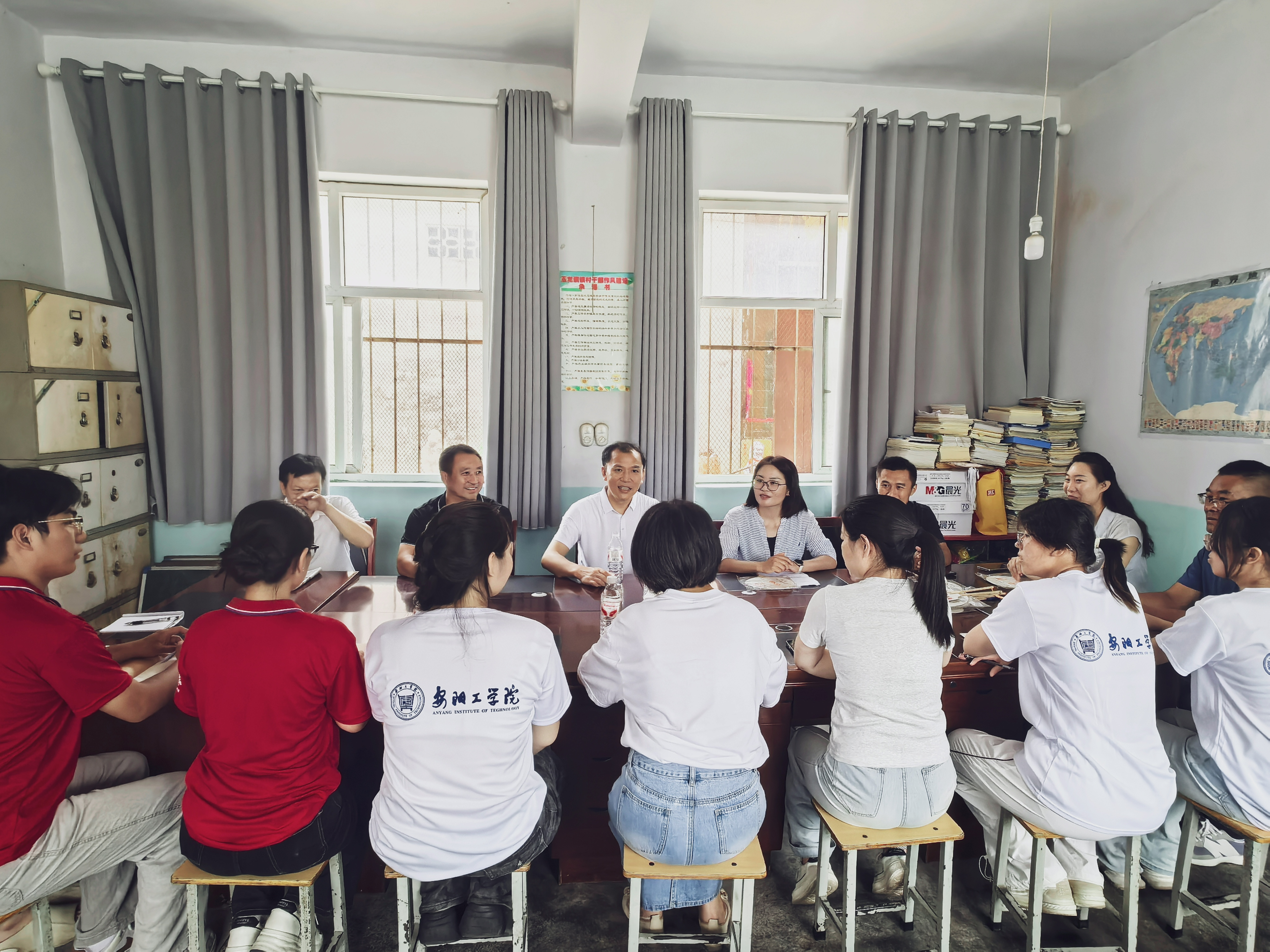 在林州市上庄小学,陈书章一行看望了我校“山乡传薪火,书梦伴青禾--民俗文化助力乡村支教”、“爱心护航,文润童心” 社会实践团队师生,听取了团队负责人关于实践活动的进展情况汇报,详细了解了同学们在支教、调研、文化宣传等方面的工作内容和成果。陈书章一行深入支教课堂,与孩子们亲切互动,对同学们的教学方法和认真负责的态度给予了高度评价。在红旗渠红色教育基地,陈书章一行看望了我校“踏渠寻迹·青心筑梦—解码红旗渠精神”社会实践团队师生并进行了深入交流,实地查看了团队成员的工作环境和生活条件,询问了大家在实践过程中遇到的困难和问题,并给予了指导和建议。