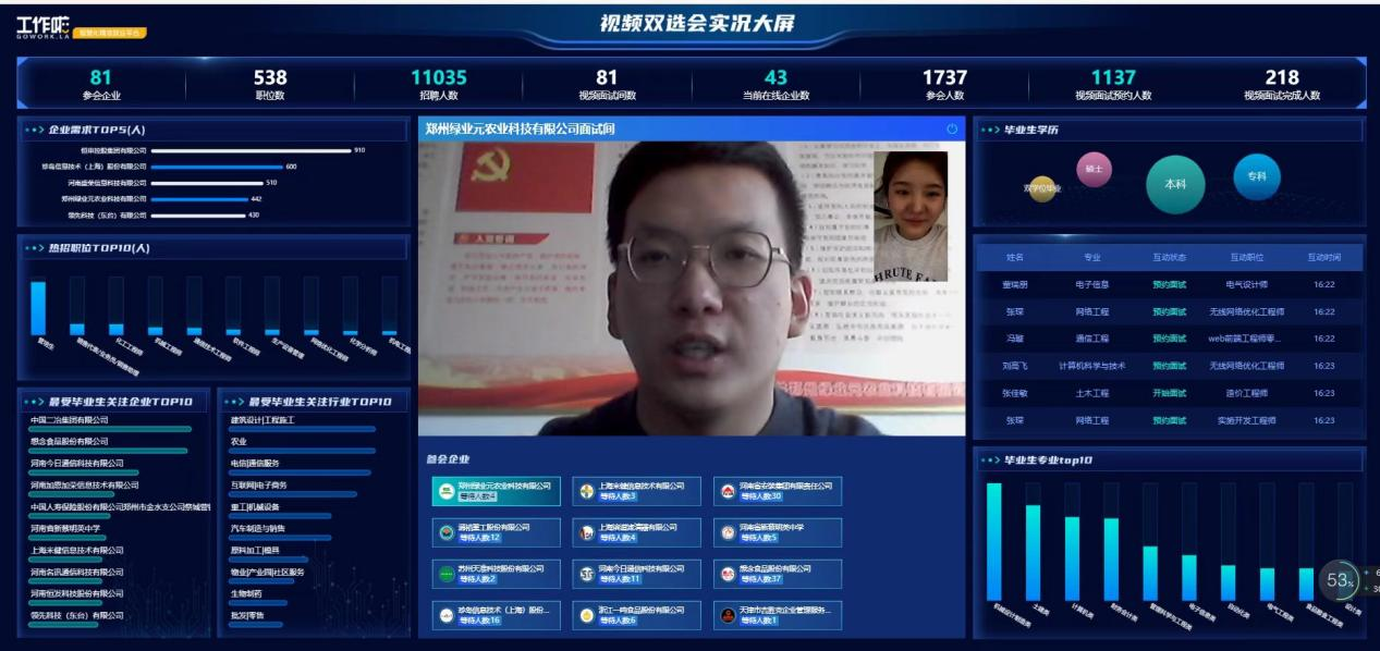 视频双选会作为就业活动新形式,为用人单位提供在线发布职位、浏览简历、视频面试等招聘形式,同时为毕业生提供在线浏览投递、预约等位、视频面试,大幅度提升招聘及面试效率。