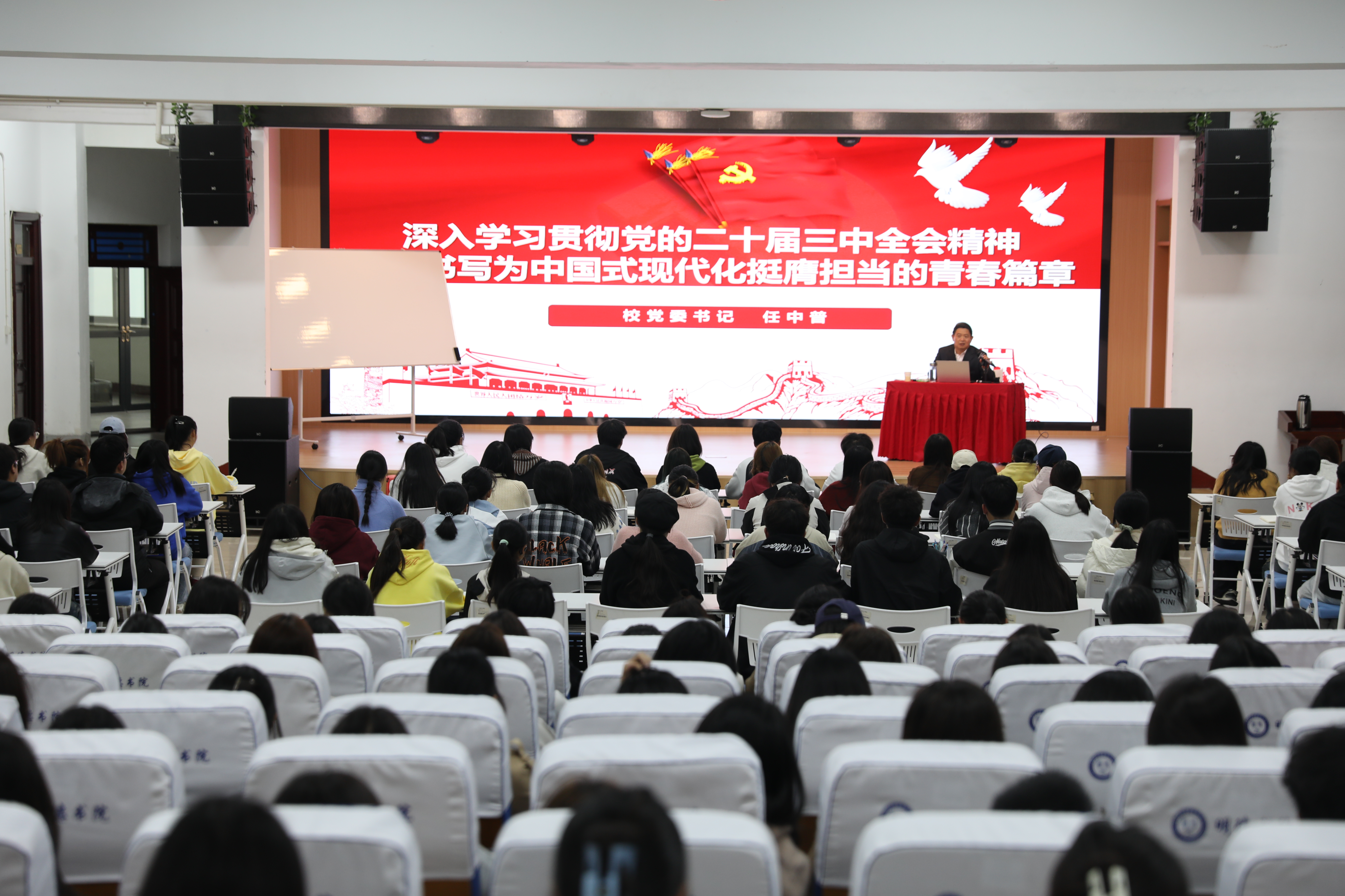 11月1日,校党委书记任中普以《深入学习贯彻党的二十届三中全会精神 奋力书写为中国式现代化挺膺担当的青春篇章》为题,为洹滨校区2024级工商管理、国际经济与贸易、会计学专业和2023级社会工作专业学生讲授思政课。