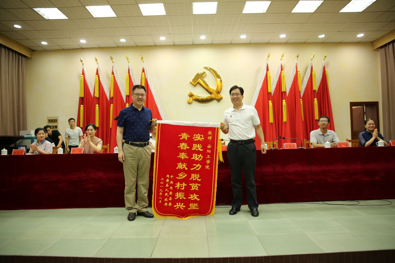 内黄县委副书记谢东代表内黄县委、县政府向我校赠送锦旗,对我校的大力支持和志愿者们的辛勤付出表示感谢,工作给予充分肯定,他说,安阳工学院通过校企合作、消费扶贫、教育捐赠、派驻第一团支书等,为内黄输送了大量的人才、科技资源,对内黄的整体发展给予了高度的关心与帮助,同学们的辛勤付出和无私奉献也为内黄脱贫攻坚注入了新的活力,希望同学们把这一个月的经历、积累和沉淀作为自身成长的经验和优势,转化为今后学习、工作和生活中前进的动力。