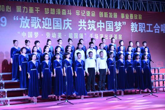在离退休老教师倾情献唱的《我家在中国》和《浏阳河》中比赛正式开始。现场高潮迭起,气氛热烈,13支参赛队伍着装整齐,精神饱满,斗志昂扬。《向往》、《雕花的马鞍》、《今天是你的生日,中国》、《长江之歌》、《歌唱祖国》、《共圆中国梦》、《唱支山歌给党听》等脍炙人口的歌曲先后唱响,熟悉的旋律,深情的演唱,展现了新中国走过的70年光辉历程,抒发了教职工的爱国情怀。其中,经济管理学院演唱的《唱支山歌给党听》情谊深切,将所有党员的心声娓娓道来;机关联队演唱的《走向复兴》气势恢弘,表达了身为中华儿女的自豪与骄傲;土木与建筑工程学院演唱的《共圆中国梦》激情洋溢,唱出了为实现伟大复兴中国梦的决心和信心;生物与食品工程学院和外国语学院演唱的《我的祖国》铿锵有力,抒发了对祖国、对家乡的无限热爱。