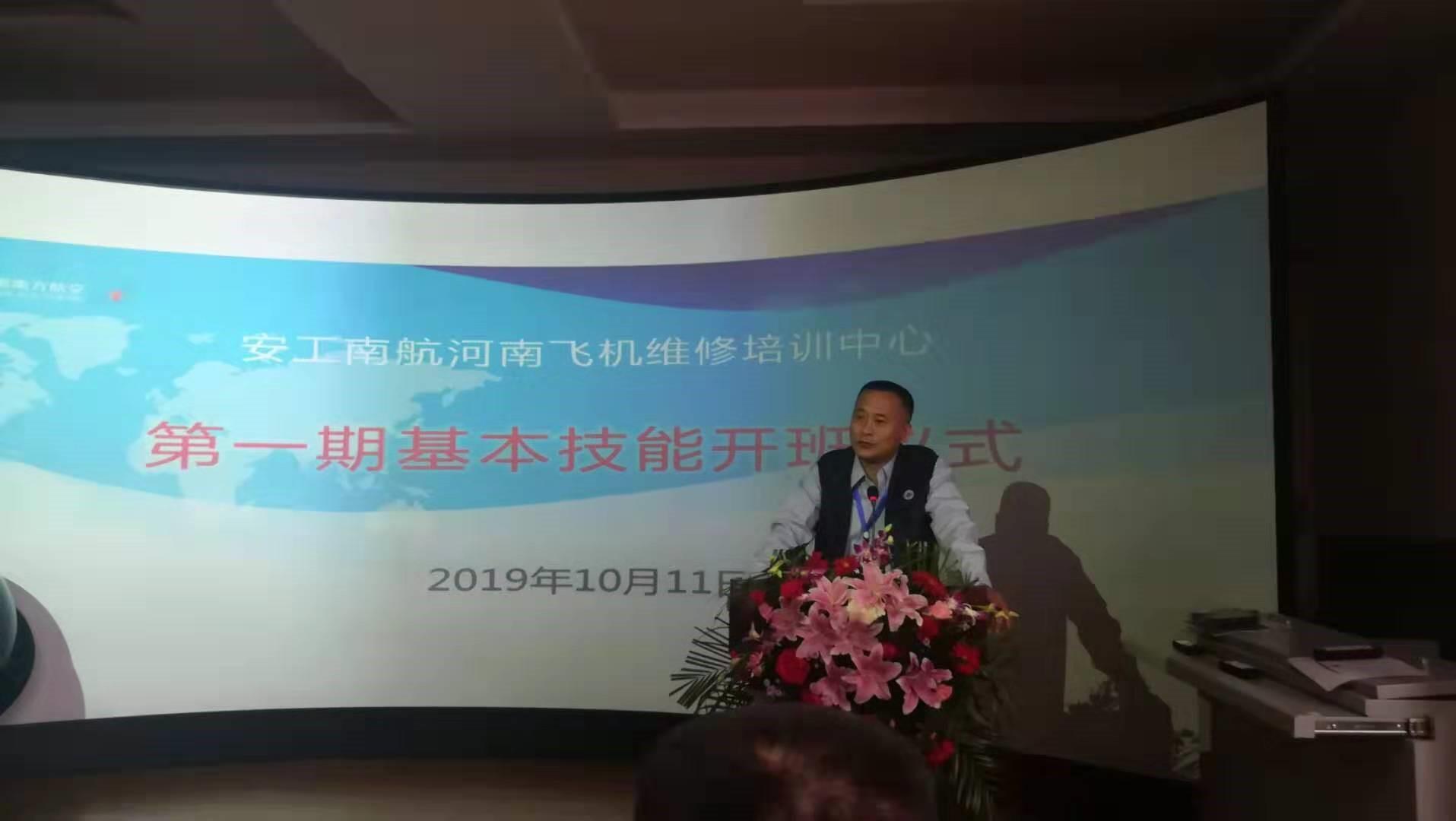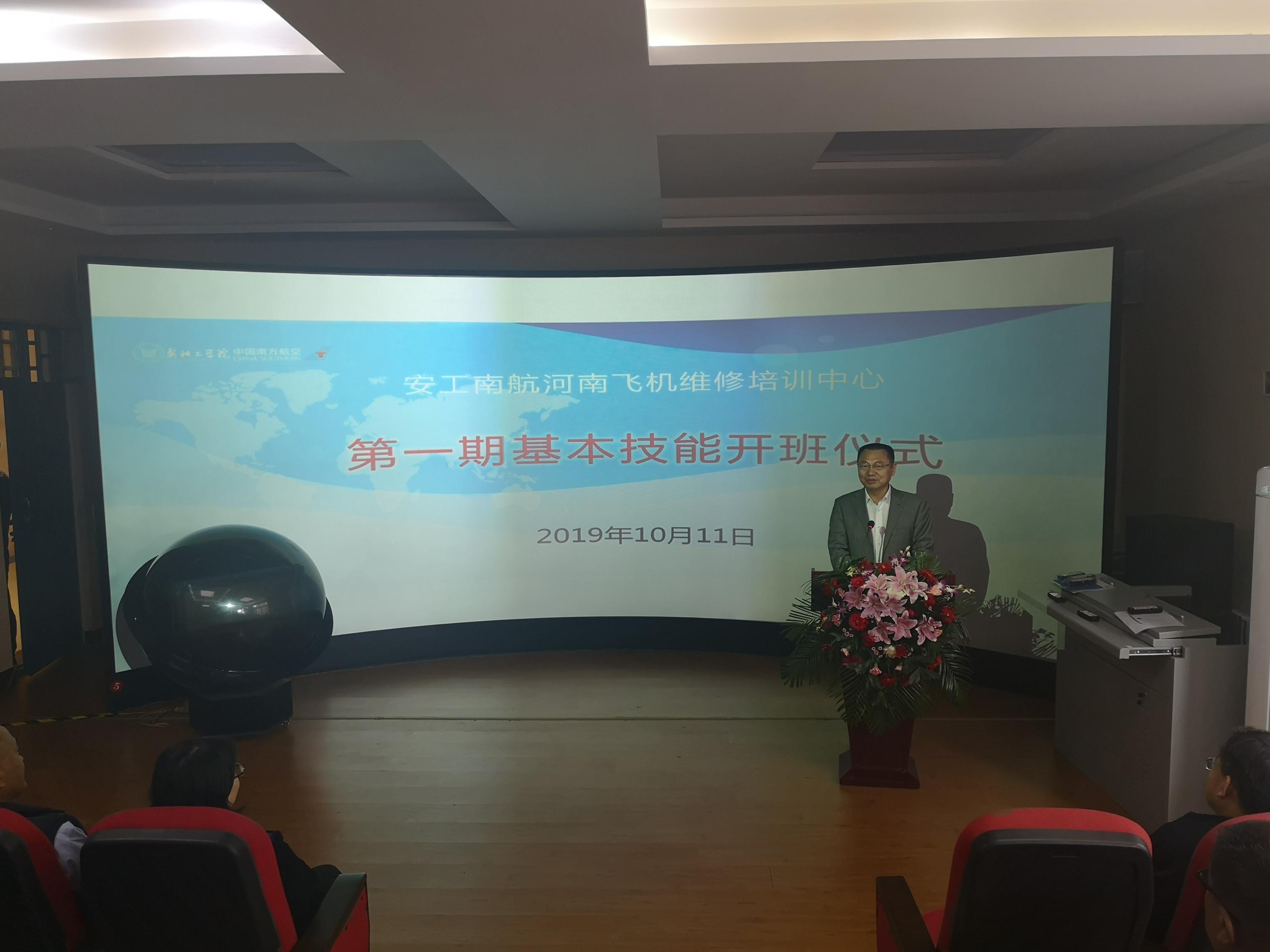 2019年10月11日下午,“安工南航河南飞机维修培训中心”第一期基本技能培训班开班仪式在我校飞行学院A15-104举行。民航中南地区管理局副处长赵燕莉,民航河南监管局副局长律华磊,南航河南公司副总崔华杰,南航机务培训中心(147协会)副经理杨国余,南航河南公司司伟森总工程师以及第一期技能班24名学员和培训中心教员等相关人员参加了开班仪式,副校长郭秋平出席,飞行学院院长杨庆祥主持会议。