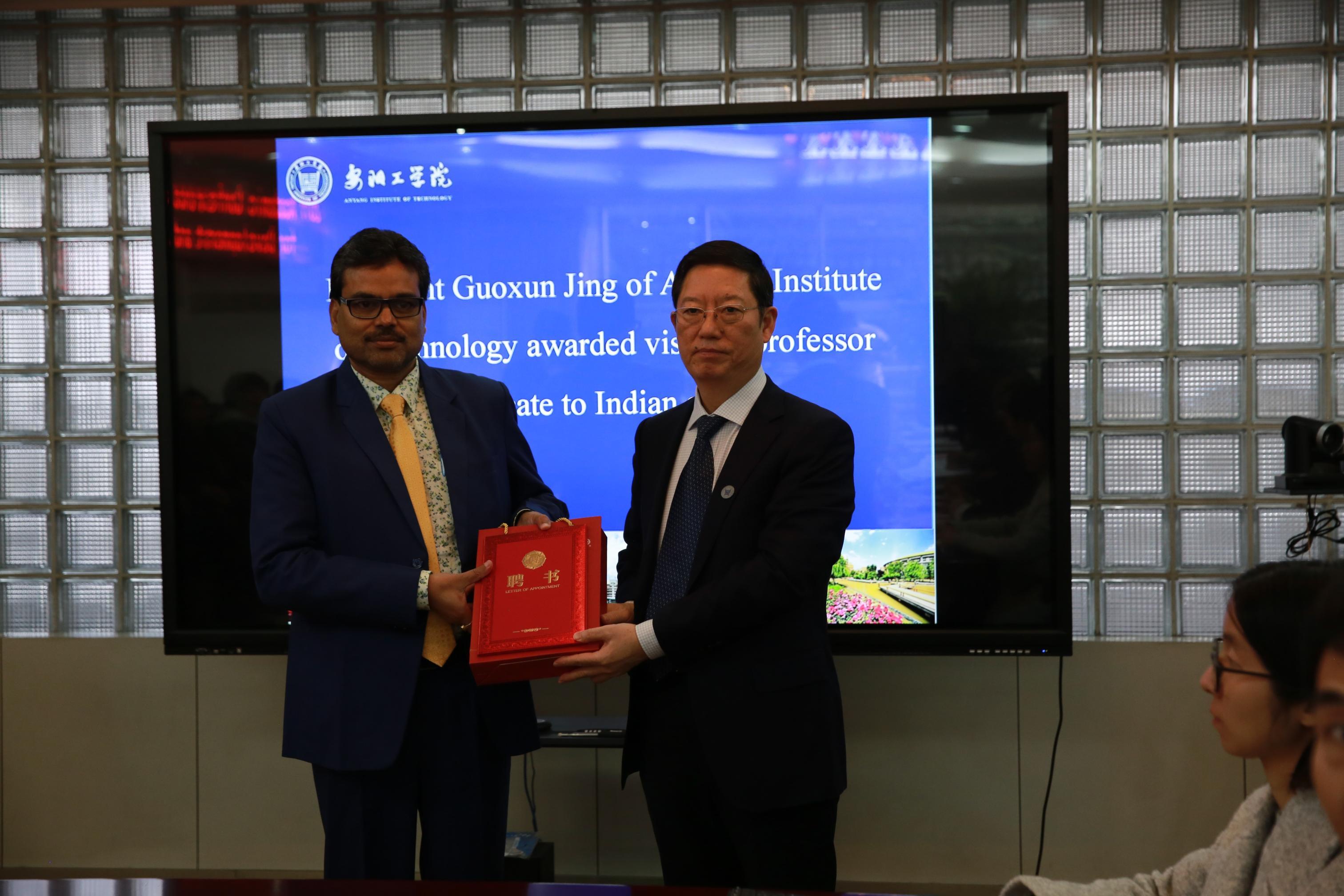 校长景国勋为印度专家Om Prakash Roy教授、Fredi Moses Managladoss教授颁发客座教授聘用证书