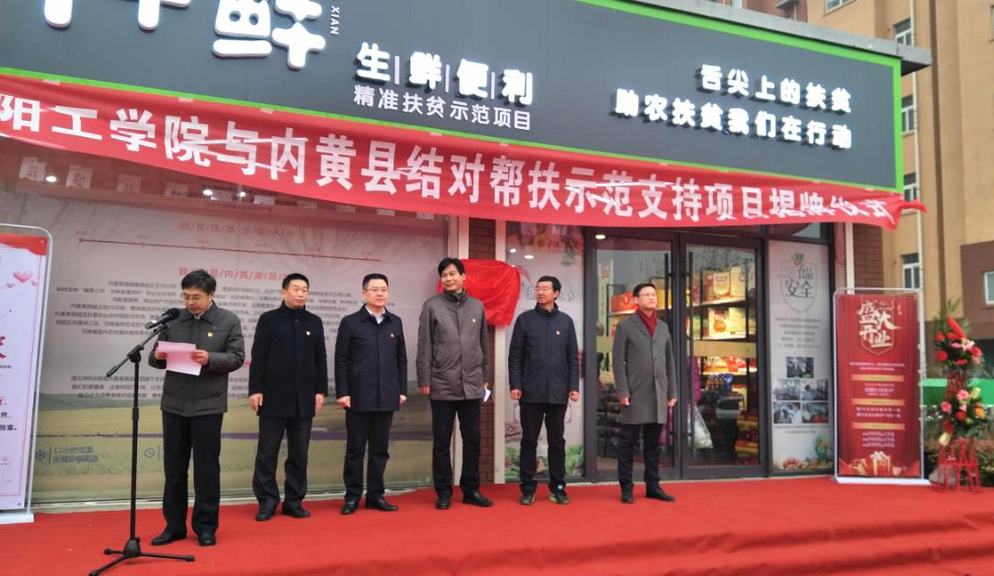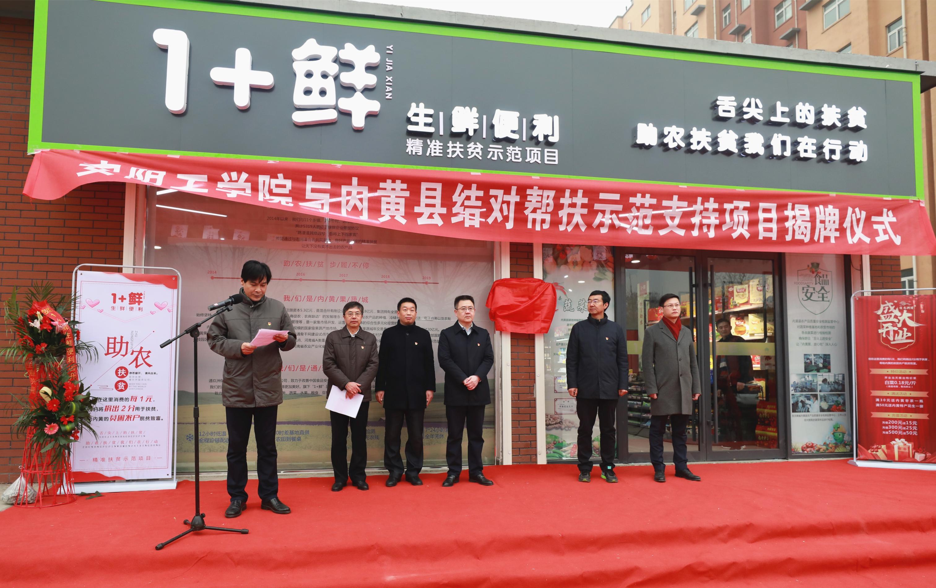 12月25日上午,我校与内黄县“校地结对帮扶”示范支持项目——“1+鲜”生鲜便利超市开业揭牌仪式在我校隆重举行。校党委副书记吴建军,副校长万鹏杰,内黄县县委副书记谢东,县委常委、副县长阎利以及内黄县和我校相关部门负责同志出席揭牌仪式。副校长万鹏杰主持仪式。