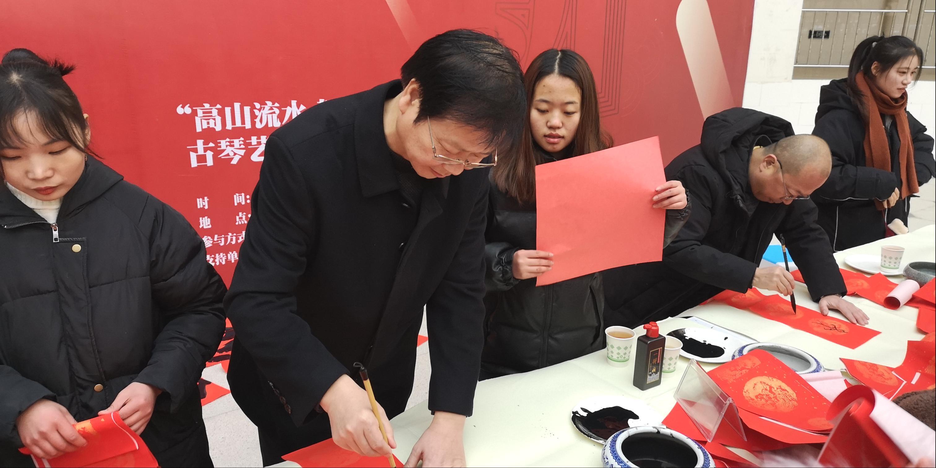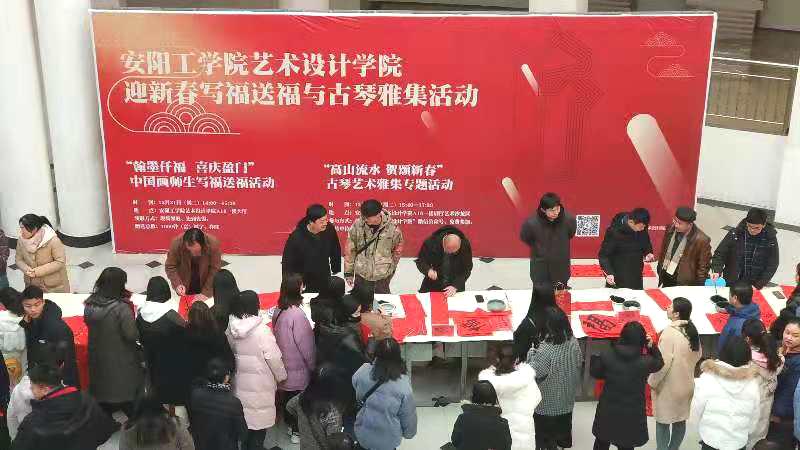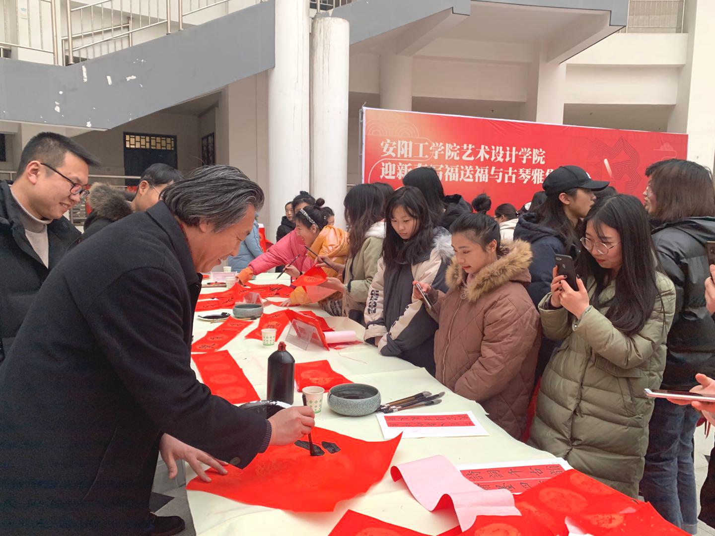 为了迎接新年的到来,传承中国传统文化,营造良好的校园文化氛围,12月31日下午,艺术设计学院举行迎新春写福送福与古琴雅集活动,校领导吴建军、牛瑞庆出席活动。