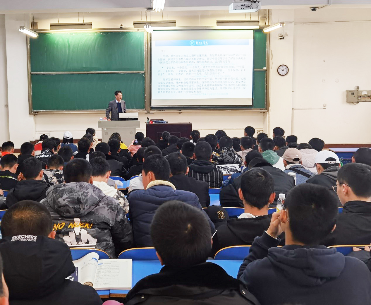 11月20日上午,副校长蒋文龙以《增强忧患意识 树立发展安全观》为题为飞行学院2020级学生讲授思政课。