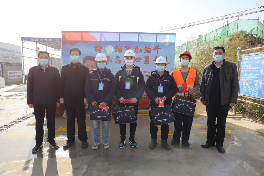 在施工现场,李凯灿、牛瑞庆和文峰区领导为一线员工代表送上春节红包、防疫健康包和新春祝福,并对他们一年来的辛苦付出表示感谢。