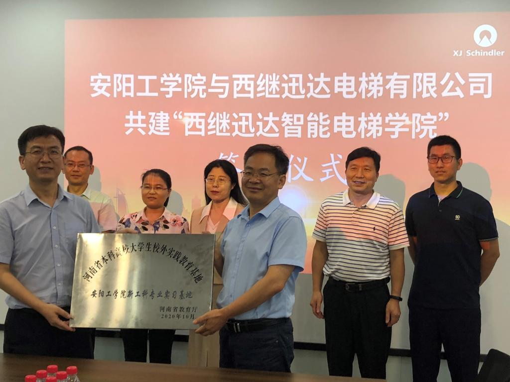 最后,郭秋平、赵红杰分别代表双方在共建智能电梯产业学院协议上签字,并共同为河南省优秀大学生校外实习基地—安阳工学院新工科实习基地挂牌。