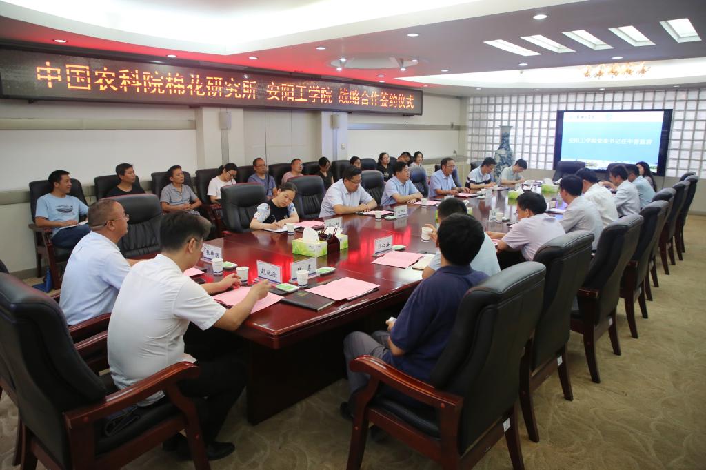 仪式上,任中普致辞,他对中棉所各位领导、专家的到来表示欢迎,对各位一直以来对学校发展给予的关心和支持表示感谢。他简要介绍了近年来学校紧密对接河南省经济社会发展、加快专业调整与优化取得的新进展、新成绩,并介绍了我校生物与食品工程学院近年来在师资培养、学科专业发展、课程建设、科研平台搭建、科研项目申报等方面取得的丰硕成果。他表示,过去五年,双方在科研平台建设、科学研究、人才培养等方面呈现出良好的合作发展态势。他希望,双方下一步继续深化合作,在高层次人才培养、学科与科研平台建设、高水平科研项目申报等方面取得新的更好的成绩。