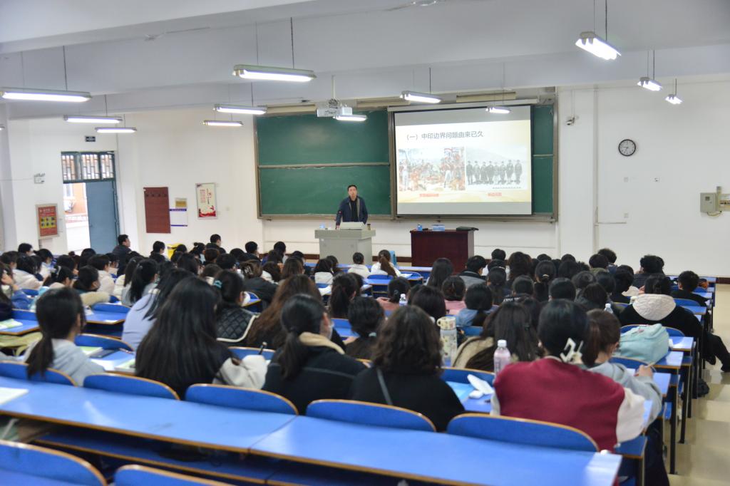 课堂上,李凯灿生动讲述了去年边境争端中中国戍边官兵的英勇表现,引导学生学习戍边英雄事迹,正确认识英雄精神,从戍边英雄事迹和伟大的抗美援朝战争中,学习祖国和人民利益高于一切、为了祖国和民族的尊严而奋不顾身的爱国主义精神和英勇顽强、舍生忘死的革命英雄主义精神。他向大家深刻分析了当前国际国内形势,引导学生正确认识中华民族的伟大复兴进程中面临的百年未有之大变局,深刻认识“构建人类命运共同体”、“一带一路”倡议等中国方案和中国智慧的重要性。