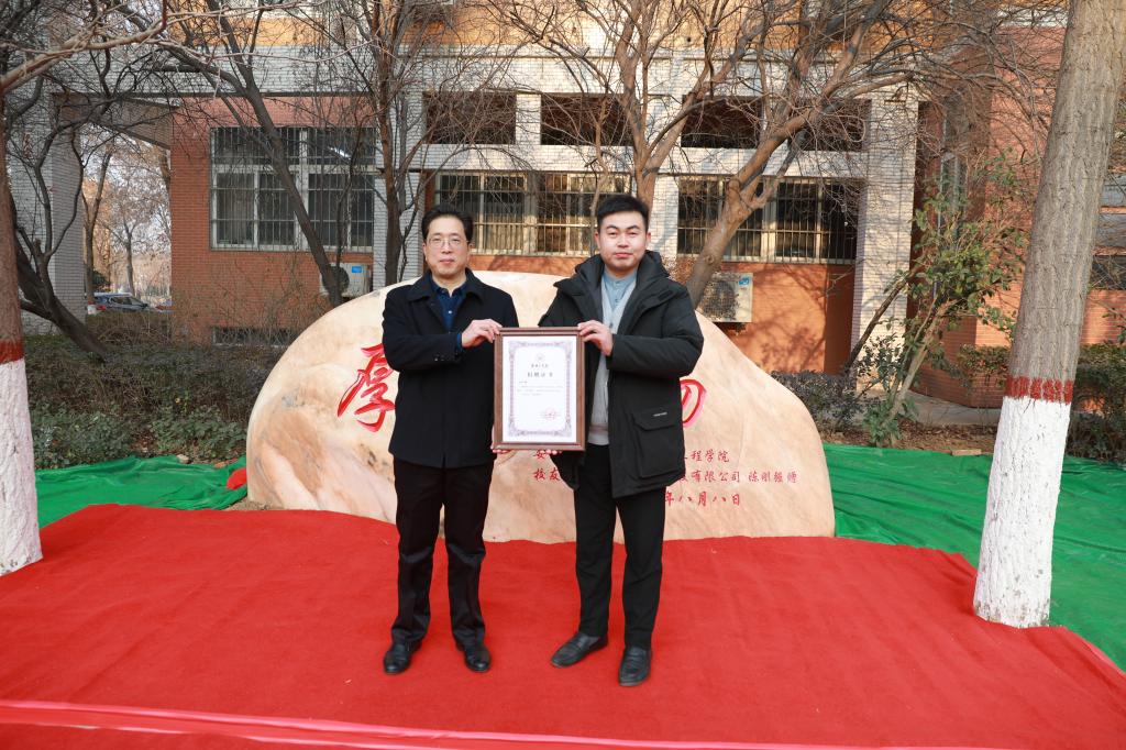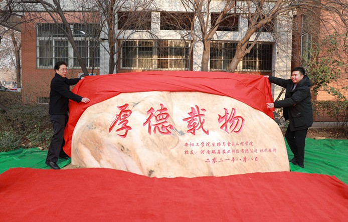 12月22日上午,我校在生物与食品工程学院举行校友陈刚强捐赠文化石仪式。副校长牛晓玉、河南瑞森农业科技有限公司董事长陈刚强校友出席仪式,学校校友工作办公室和生物与食品工程学院领导班子及师生代表参加捐赠仪式。生物与食品工程学院院长张坤朋主持仪式。
