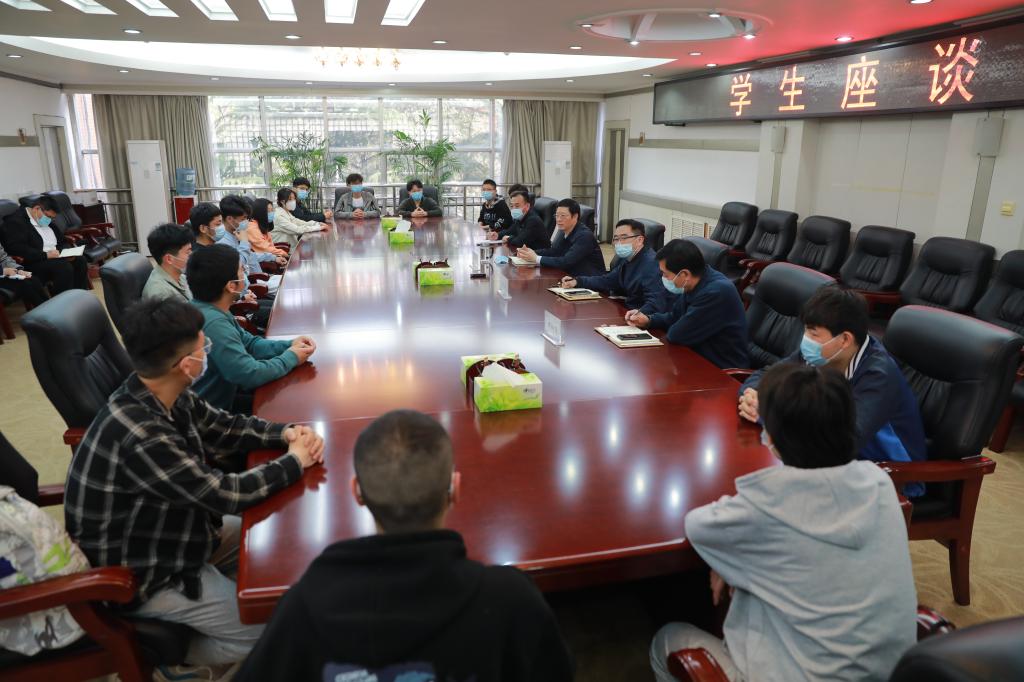 4月13日下午,校长景国勋在行政楼二楼会议室主持召开学生座谈会。校长办公室、学生工作处、后勤管理处、机械工程学院等部门负责人以及机械工程学院机械设计制造及其自动化专业2020级1班学生代表参加座谈。