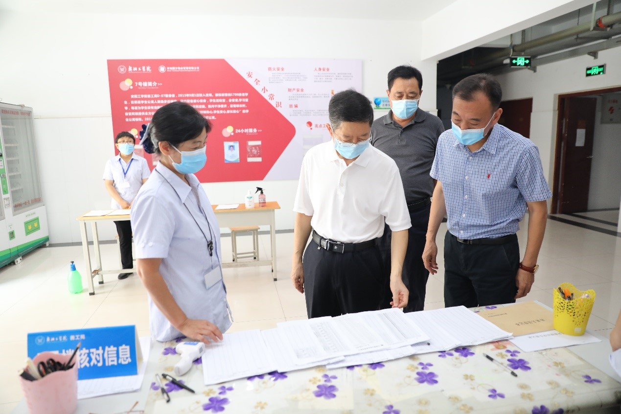 景国勋一行先后到校门口、A02教学楼、一号餐厅、善工苑学生公寓等处,现场检查指导疫情防控、教学设备准备、校园环境整治、防疫物资储备、安全隐患治理等各项工作,听取相关部门秋季开学各项工作准备情况,全面查看疫情防控各环节,并检查指导防控实战演练。