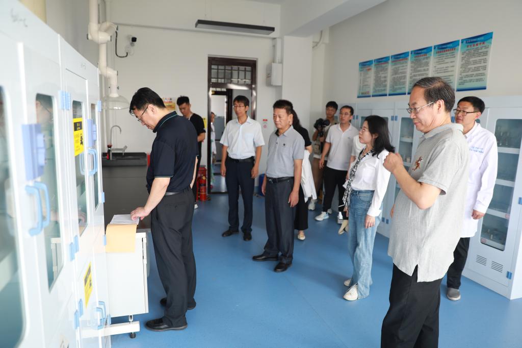 沈记全一行来到化工学院实验室,听取学院负责人和实验室负责人对实验室安全管理等工作的介绍,重点对实验室日常安全管理、危险化学品管理及台账记录进行了检查,详细了解教学和科研实验室开展情况。沈记全对化工学院的实验室建设和安全工作表示高度认可,重点强调了实验室安全的重要性,并对化学试剂的领用制度等内容提出了进一步完善与整改的具体要求。